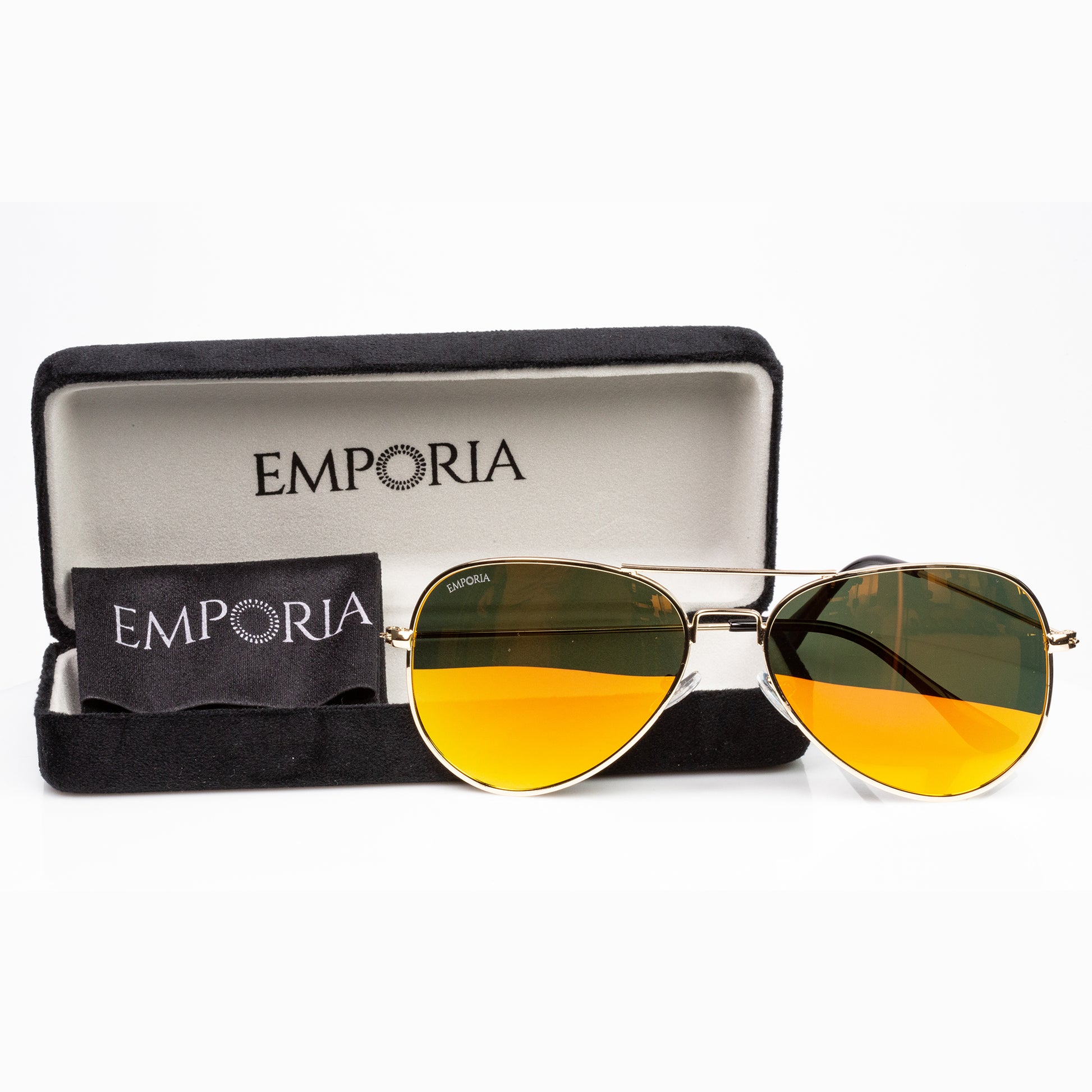 Emporia Italy - séria Aviator "SLNEČNÉ LÚČE", polarizované slnečné okuliare s pevným puzdrom a čistiacou handričkou, oranžové šošovky, obrúčky zlatej farby